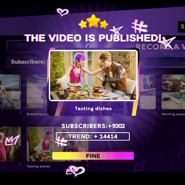 Video publishing — recording becomes available once a story-driven preparation meter fills. Players choose from four video topics, each launching a unique minigame.